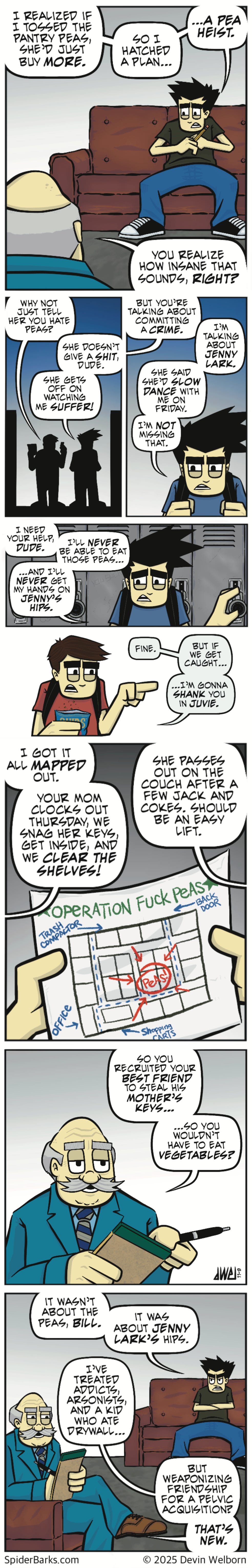 Mike’s still on the couch and getting deeper into the details of his hatred for peas. What started as a talk about holiday trauma has turned into a full-blown middle school flashback—and his mission to get peas off his dinner plate and his hands on Jenny Lark’s hips.