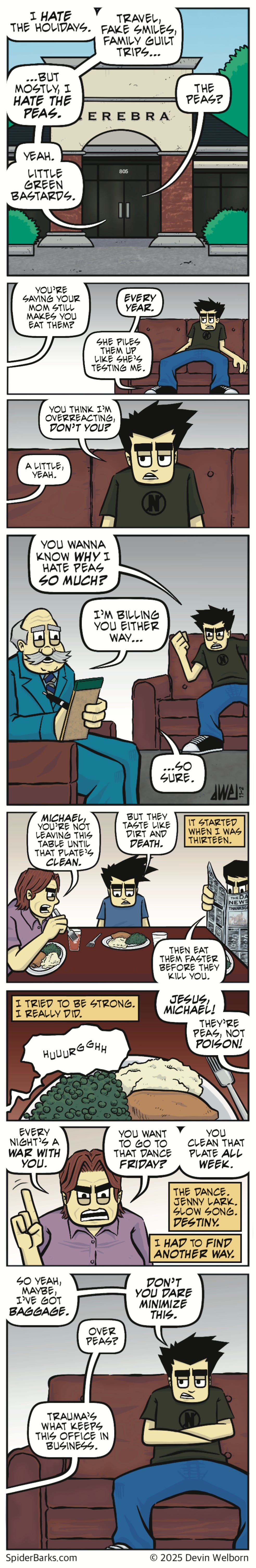 The holidays are here, and Mike’s not handling it well. November kicks off a brand new Spider Barks story, Plate of Misery. In therapy, Mike unearths his deep-seated holiday trauma—and the story behind his undying hatred for peas. His memories drift back to middle school, where it all began.