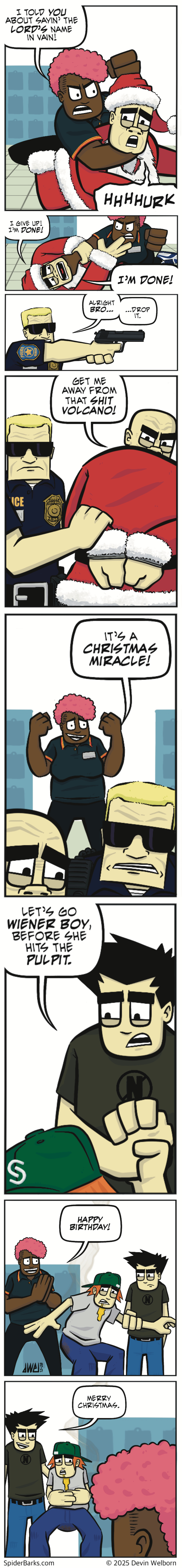 Christmas Eve at the Fuel & Flask concludes as Santa loses control, faith turns feral, and the cops barge in. Even the most bitter heart in the room has to confront the spirit of the season—whether Mike likes it or not. Spider Barks closes out the year exactly the way it should: loud, gross, and unexpectedly human.