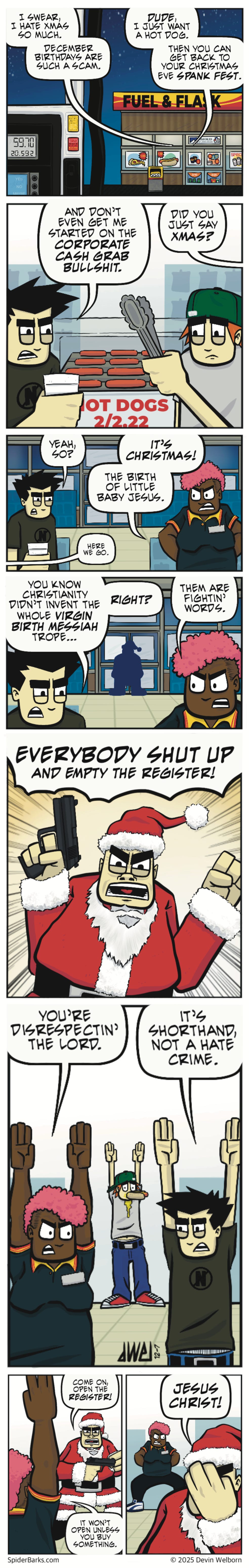 The holidays are stressful, and Mike can’t hide his bitterness on a quick Christmas Eve hot dog run. His petty grievances spark a bickerfest, completely distracting everyone from the surprise guest who turns the evening upside down in true Spider Barks fashion.
